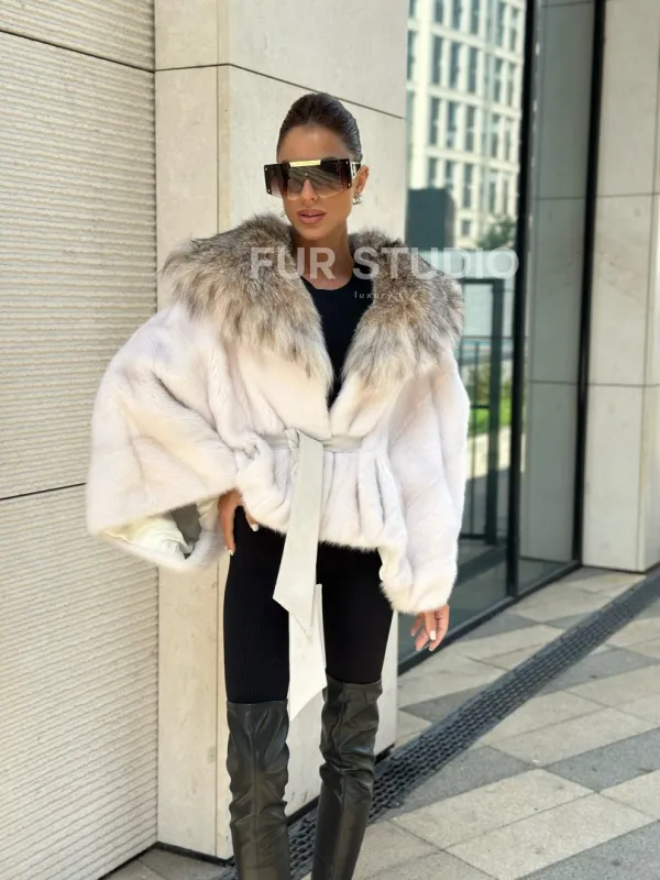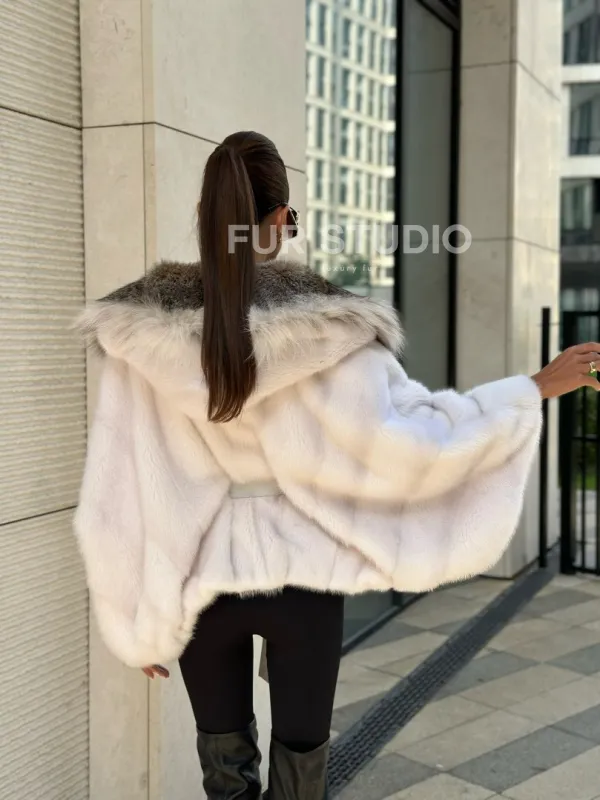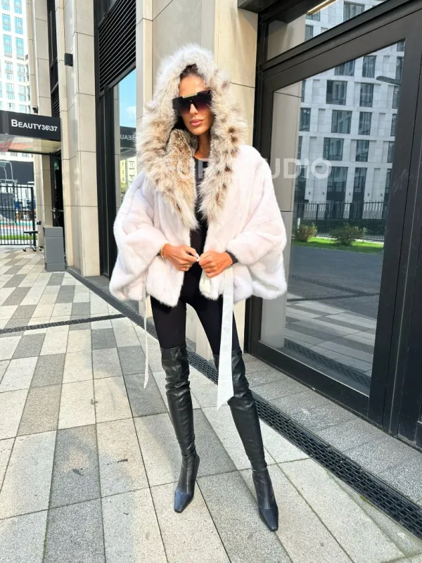 Белое норковое манто с капюшоном из меха рыси – выбор девушек, которые готовы экспериментировать. Летучка сделает ваш образ легким и воздушным. Необычный цвет напомнит о лете и освежит ваш стиль. Нежный мех бережно согреет владелицу в любые холода. Шикарный капюшон из рыси позаботится, чтобы волосы были в тепле.