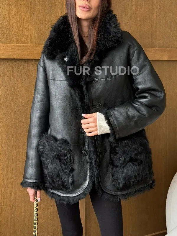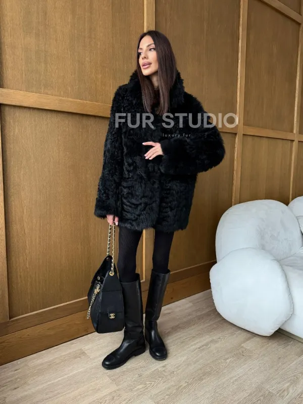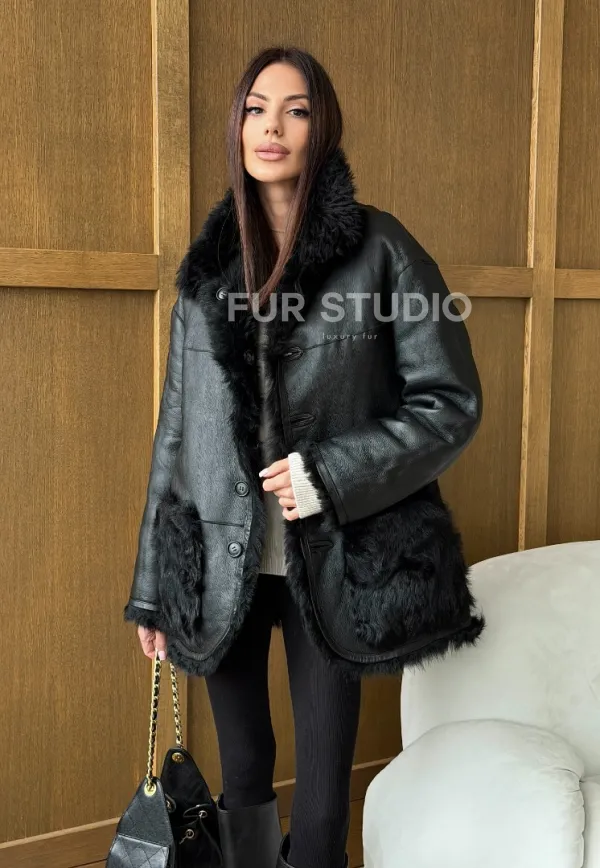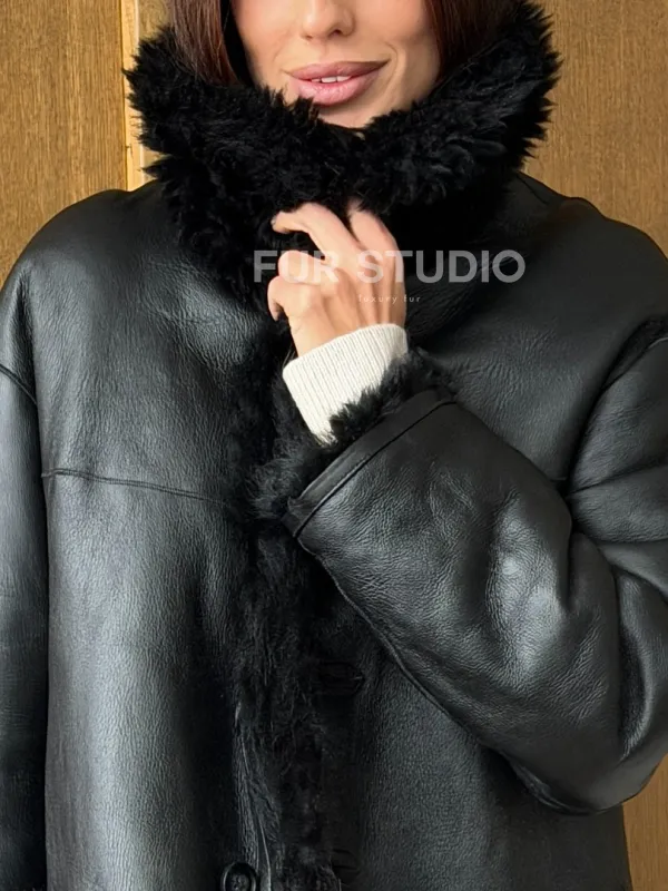 Черная двухсторонняя дубленка из меха тиградо 102755