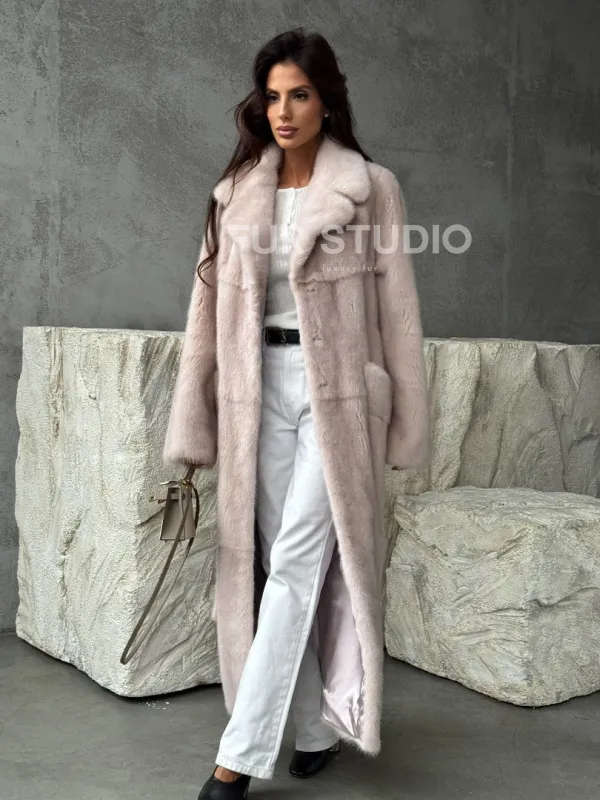 Мех данной шубы аукционная норка , цвет бежевый. Предлагается в размерах от 42 до 50. Длина модели 125-130 см, что выгодно подчеркивает фигуру девушек. Эта модель идеально подойдет для девушек и женщин, предпочитающих роскошные натуральные меха.